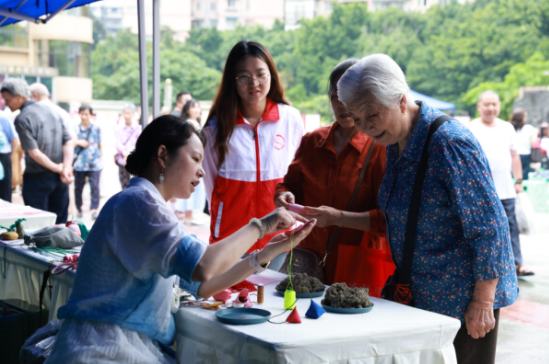 主舞台之外,非遗互动区也是热闹非凡。剪纸、植物染、香包、古琴等非遗技艺现场展示,并邀请现场观众互动,亲自体验非遗文化;书法创作展示区人流如织,书法干部及专业老师亲笔书写并赠送观众福卡。