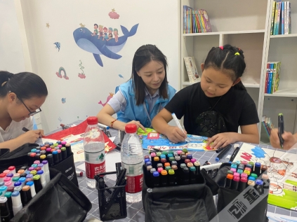 在鲤鱼池社区,小朋友们正拿起画笔和颜料,兴致勃勃地开始创作。绚丽鲜艳的颜色,天马行空的想象,信手涂鸦的画作,孩子们在志愿者的陪伴下开心地画着属于自己的文明家园,他们以画寄情,从不同角度用自己独特的童真抒发对城市的热爱和想象。