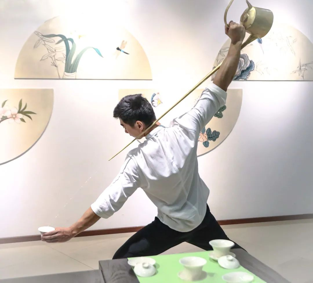 除了表演气质的独具特色,一木派长嘴壶同样有着自己独创的系列表演。一木派长嘴壶的传承人根据重庆的文化历史,创作出《听山》《问水》两个系列的表演,将重庆的大好河山以及历史精神融入长嘴壶中。