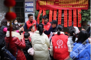 “福满华堂添富贵,财临吉宅永平安”、“门迎富贵平安福,家庆祥和康乐年”、“山经春雨清如洗,柳坐东风翠欲流”......为了让孩子们了解春联的来历和寓意,体验传统文化的独特魅力,志愿者带着孩子们写“福”字、写春联。现场春意融融、温馨热烈,地上铺满的志愿者和孩子们写的春联和“福”字,红艳艳一片,显得格外好看。