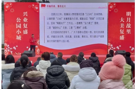 活动在优美动听的歌曲《康复兴盛》中拉开序幕。优秀社区书记榜样程踊以《学习贯彻党的二十大精神 为复盛发展注入活力》为题,向干部、群众重点解读了党的二十大的主要成果和丰富内涵,并就如何擦亮“活力青工”营商、“健游华山”文旅、“三棵树”治理三张名片进行了分享。