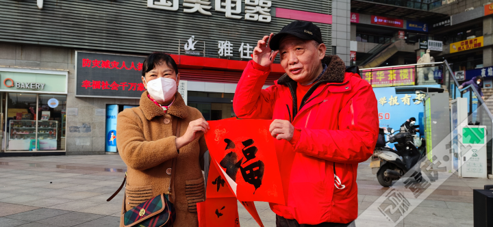活动现场,飘满墨香,现场桌子一字排开,他们铺台蘸墨,为周边居民免费写、赠春联,有求必应。路人纷纷过来围观,求墨宝。他们取笔沾墨,在红纸上挥洒自如,有的笔力遒劲,充满喜庆、吉祥、祝福的对联和福字,很快随笔而出、一气呵成。一幅幅象征着吉祥如意的春联,表达了对人民群众美好的节日祝福。
