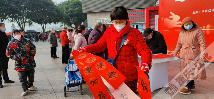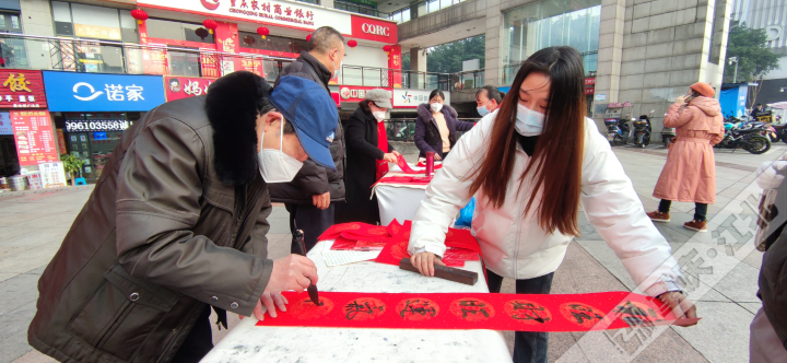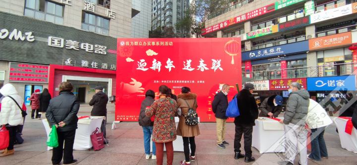 春节将近,结合“我为群众办实事”实践活动,2023年1月6日上午,五里店街道在曼哈顿广场开展“迎新年 送春联”活动,邀请江北区书法家协会的5位书法家现场挥毫为群众书写春联,免费赠送。