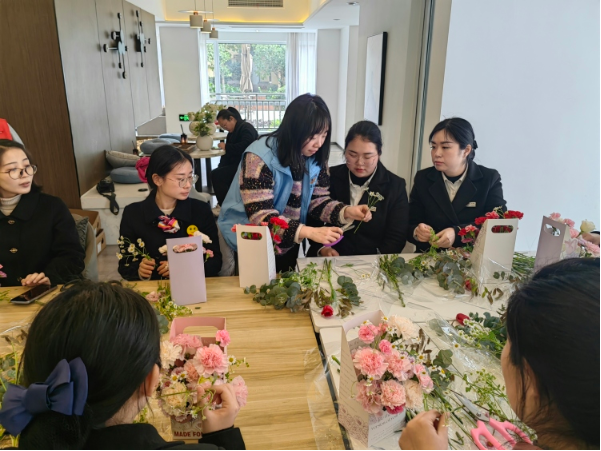 花道是中国传统修身养性、陶冶身心的生活艺术,为丰富辖区内居民精神文化生活,进一步提升辖区女性综合素质和生活品位,3月4日下午,鱼嘴镇和悦社区在辖区“新智荟”驿站开展了“和悦汇社企一心 新阶有约绽芳华”妇女节主题活动,让妇女职工们在工作之余感受生活之美,一起迎接春天的脚步。