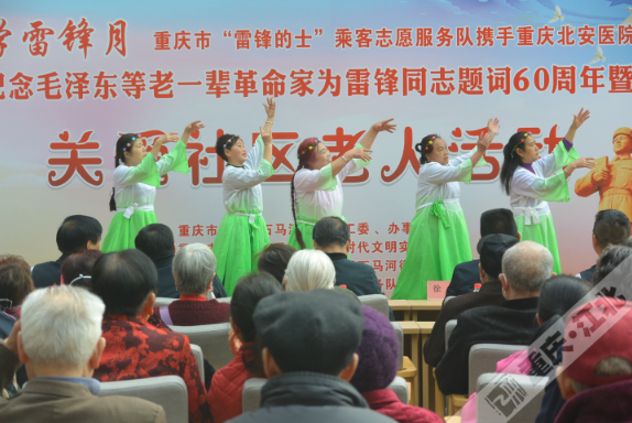 为纪念毛主席“向雷锋同志学习”题词发表60周年,进一步弘扬雷锋精神和“奉献、友爱、互助、进步”的志愿精神,推进志愿服务制度化、常态化发展。3月9日上午,江北石马河街道举办纪念毛主席题词向雷锋同志学习60周年文艺演出,辖区40余名老人参加观看。