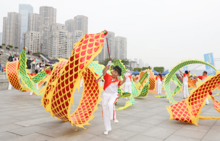 近日,“龙舞江北嘴·腾飞新重庆”——江北城街道在重庆大剧院开展舞龙表演活动,活动现场热闹非凡。