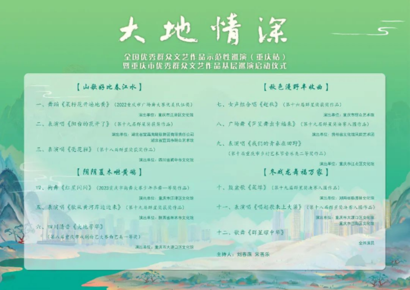 “大地情深”全国优秀群众文艺作品示范性巡演,是文化和旅游部为深入学习宣传贯彻党的二十大精神,助推公共文化服务高质量发展,坚持以人民为中心的创作导向,在全国范围内实施的重要文化盛会。巡演活动充分发挥优秀群众文艺作品的示范引领作用,让广大人民群众共享文化发展成果。