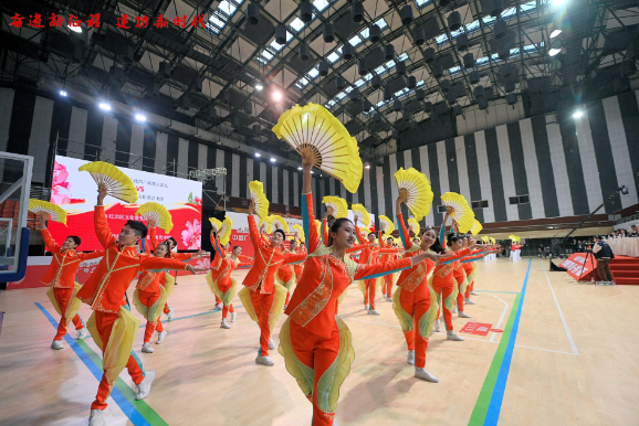 在“规定舞蹈”环节中,全体参赛队伍齐跳新编广场舞《大地欢歌》,跃动的旋律、欢快的舞姿,瞬间点燃现场氛围,展现出新时代群众生活的满满幸福感,彰显出新征程中的崭新气象。