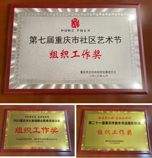 在活动现场颁发的重庆市群众文化品牌组织工作奖中,江北区荣获“欢跃四季·舞动山城”2023重庆市广场舞展演、“欢跃四季·舞动山城”2023重庆市街舞大赛、第二十一届重庆市美术书法摄影联展、2023重庆市大家唱群众歌咏活动、“和谐社区·幸福生活”第七届重庆市社区艺术节等五项组织工作奖,成绩名列全市前茅。
